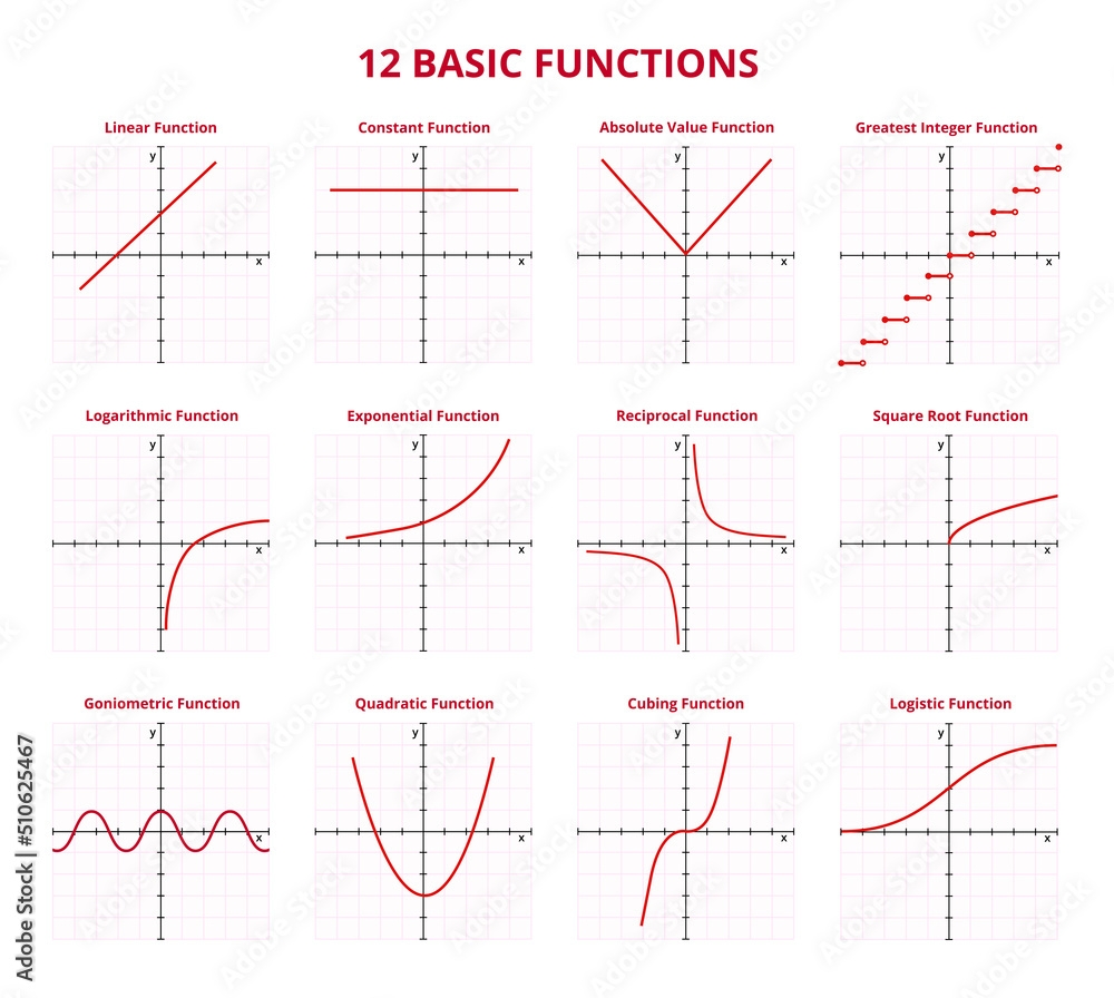 Vector Set Of Graphs With 12 Basic Functions Linear Constant Absolute Value Greatest Integer Logarithmic Exponential Reciprocal Square Root Goniometric Quadratic Cubing Logistic Function Stock Vector Adobe Stock